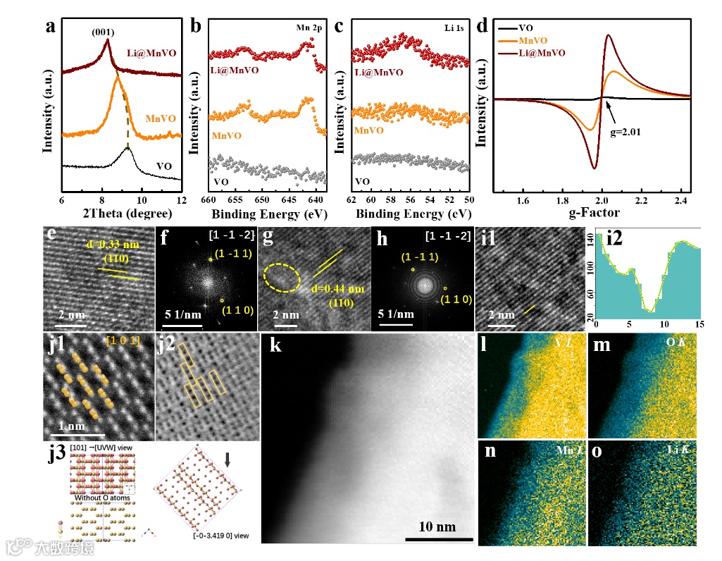 XRD及XPS分析表明由于Mn、Li双离子的顺序插层使得V2O5的层间距连续扩大。进一步结合HAADF-STEM、ABF-STEM及晶体结构分析证明Mn、Li离子存在于VO层间, 且淬火后,Li@MnVO表面出现一定量的V原子缺失。EELS分析中Mn和Li的均匀分布,进一步证明了Mn和Li离子的成功插层。此外结合EPR分析证明了Li@MnVO表面及近表面存在大量的氧空位。