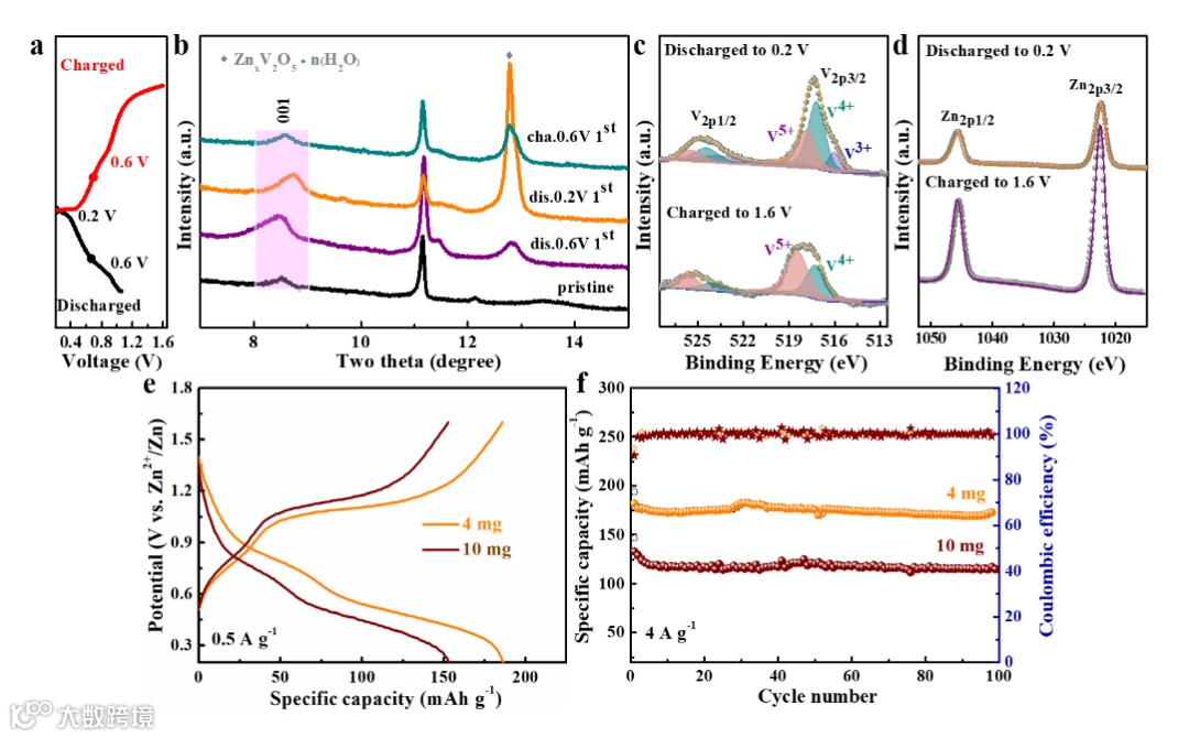 更有趣的是,当质量负载增加到10 mg cm-2时,在4 A g-1的电流密度下,容量可以很好地保持在125 mAh g-1。本研究的“双离子顺序”插层策略为开发层状金属氧化物阴极提供了新的机会,并为设计高性能且安全ZIBs提供了新的见解。