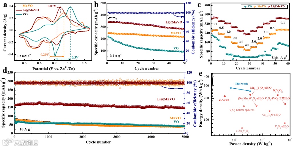 与V2O5和MnVO相比,Li@MnVO具有更小的极化电压,更高的电化学可逆性和更好的结构稳定性。与V2O5的225 mAh g-1相比,Li@MnVO的比容量显著提高,初始比容量高达342 mAh g-1。在10 A g-1的高电流密度下,初始容量达165 mAh g-1(为MnVO和V2O5的三倍)获得了超过5000次的长循环性能,库仑效率为99.2%。这进一步说明了“双离子顺序”插层相比于单离子插层的优越性。