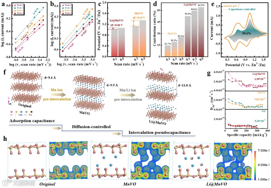通过 “单离子”和“双离子顺序”插层,我们实现了对钒氧化物层间距d的连续调控。随着V2O5层间距的不断增大,Zn2+的存储机制由固态扩散转变为插层赝电容行为。由于插层赝电容极大提高了Li@MnVO阴极的扩散动力学和缺陷增强了阴极的电导率,采用顺序插层的方法制备的Li@MnVO阴极具有独特的电化学性能,在0.1 A g-1下可获得343 mA h g-1的可逆容量,在10 A g-1下可循环5000次,容量保持率为91%。