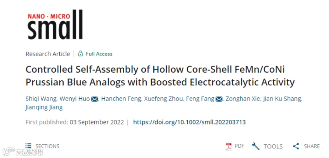 基于此,东南大学方峰教授团队在国际知名期刊《Small》上发表题为“Controlled Self-Assembly of Hollow Core-Shell FeMn/CoNi Prussian Blue Analogs with Boosted Electrocatalytic Activity”的研究论文。