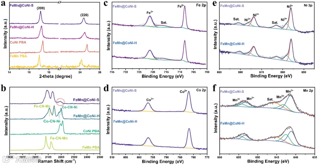 图3 FeMn@CoNi–S和FeMn@CoNi–H的(a)XRD; (b) Raman spectra; (c-f) XPS spectra