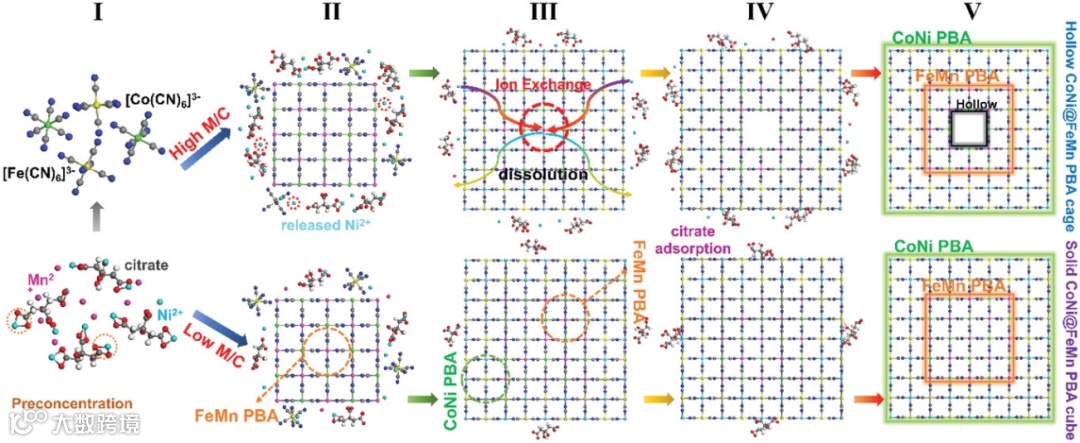 特殊的空心结构由金属阳离子与金属氰酸根的种类与浓度以及柠檬酸盐的比例协同作用决定。DFT计算结果表明,Ni2+和Mn2+与不同有机配体结合能力的差异,导致形核速率的不同,促使Mn2+优先与[Fe(CN)6]3-形核,形成FeMn PBA内核;而Ni2+在柠檬酸根的作用下与[Co(CN)6]3-形核的速率低,从而在FeMn PBA内核上形成CoNi PBA外壳。此外,高浓度Ni2+的环境下会引起离子交换,使FeMn内核部分分解,形成空心结构,如图6所示。