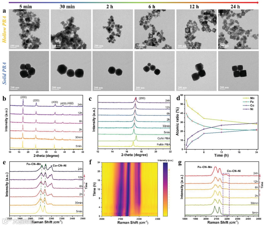 制备了不同合成时间的两种系列样品,并揭示了其自组装过程。对于FeMn@CoNi–S,自组装过程前期,先形成FeMn PBA内核, 随着反应进行CoNi PBA在内核表面生长,进一步内核随着反应时间延长部分开始分解形成空心结构,最终形成核壳结构的空心立方体笼。对于FeMn@CoNi–H, 其前期过程与FeMn@CoNi–S类似,但随着时间延长, FeMn内核保持稳定,最终形成实心核壳立方体。