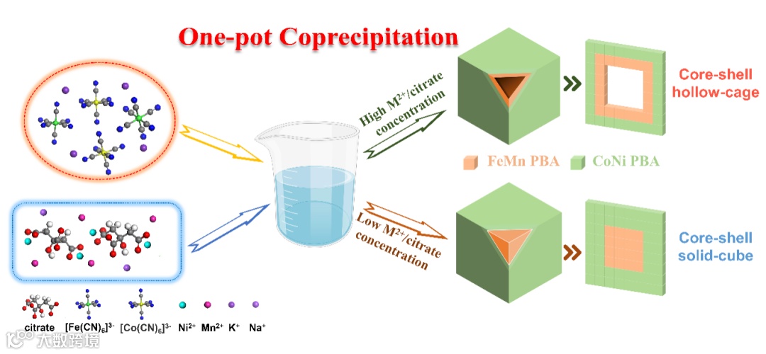 通过系统的对比实验与DFT计算,证实了自组装形成核壳结构过程得益于活性剂(柠檬酸盐)的引入和有机配体金属氰酸根与金属离子间不同的形核速率,而空心/实心结构的形成由金属离子的浓度差异引起。该工作对普鲁士蓝类似物及其他MOF材料的成分与结构设计具有借鉴意义。