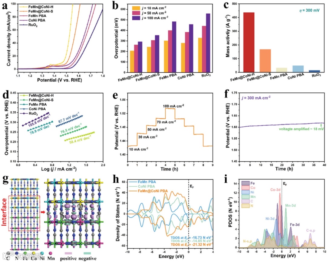 FeMn@CoNi–H催化剂具有优异的OER活性。碱性环境(1M KOH)下,FeMn@CoNi–H达到10 mA/cm2电流密度时,过电位仅236 mV,同时具有 58.4 mV dec-1超低Tafel 斜率,明显优于商用贵金属催化剂(RuO2);同时,FeMn@CoNi–H具良好的OER稳定性,高电流密度下(300 mA/cm2)持续40h测试,性能没有明显衰减。BET测试和电化学活性面积结果表明,FeMn@CoNi–H具有更多的暴露活性位点。DFT计算结果表明,异质核壳结构解够有效调节整体的电子结构,协同提高OER反应动力学。
