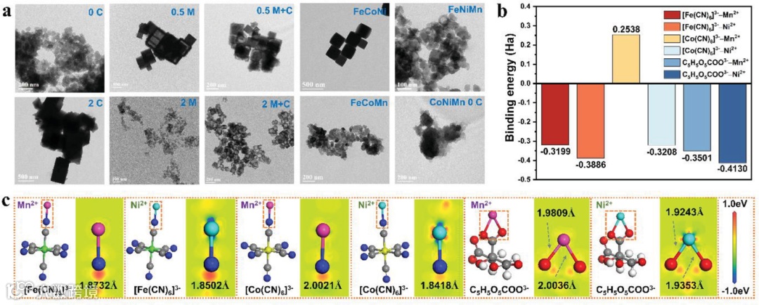 图5(a)不同对比样的TEM图;(b)Ni2+与Mn2+与不同有机配体的结合能;(c)Ni2+与Mn2+与不同有机配体的二维差分密度图