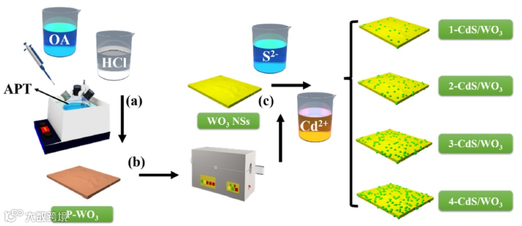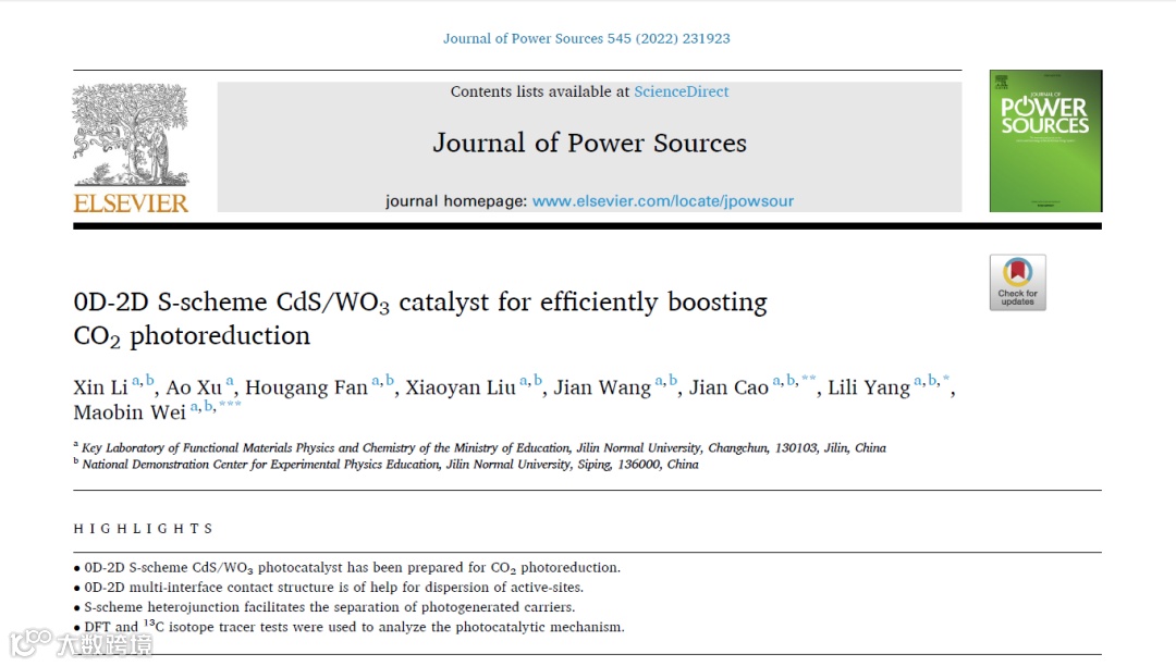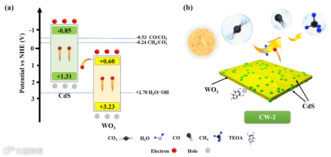 吉林师范大学曹健、杨丽丽、魏茂彬等人以二维WO3为载体及氧化型半导体通过简单的连续离子层吸附反应,在其表面负载量子点级CdS,成功地制备了0D-2D WO3/CdS S型光催化材料体系。利用维度间的尺寸差异,WO3纳米片极大地提高CdS量子点分散性,有效降低还原位点的团聚现象,进而提高CO2分子在还原位点的吸附与还原效率。