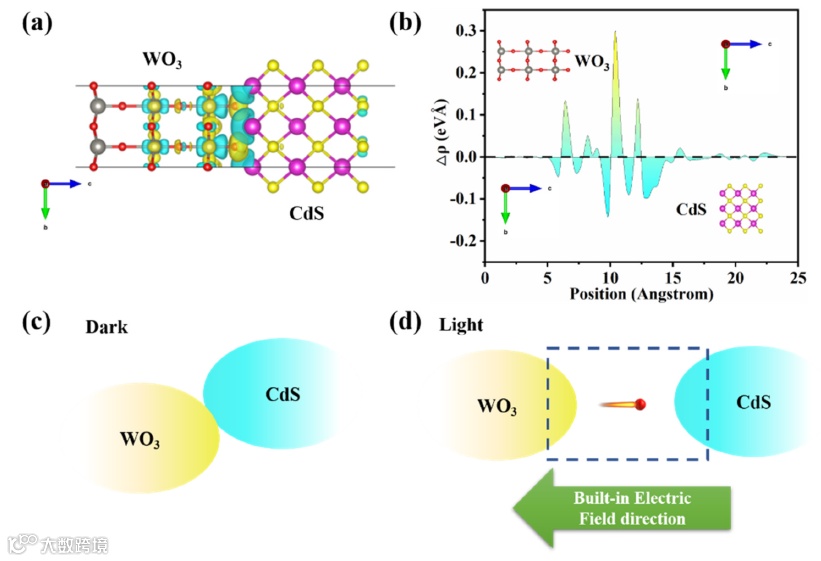 Fig. 2. WO3/CdS 差分电荷密度(a);Z轴平面平均电子密度差(b),CdS/g-C3N4界面电场的形成及电子传输示意图(c, d).