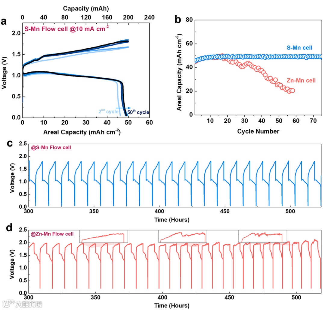 图 4. S-Mn液流电池和 Zn-Mn液流电池比较。(a) S-Mn液流电池在50 mAh cm–2下的电压曲线。(b) 充电面容量为50 mAh cm-2下的 S-M和 Zn-Mn液流电池的循环保持率。(c) S-Mn电池的选定圈数电压曲线。(d) Zn-Mn 电池的选定圈数电压曲线。