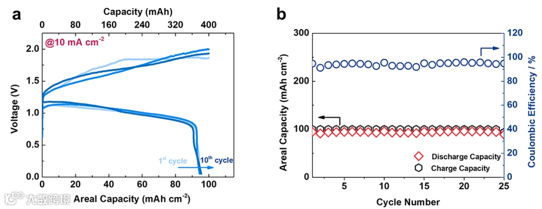 图 5. S-Mn液流电池在100 mAh cm-2高面容量下的电化学性能。(a) S-Mn液流电池的电压曲线。(b) S-Mn液流电池的循环稳定性。