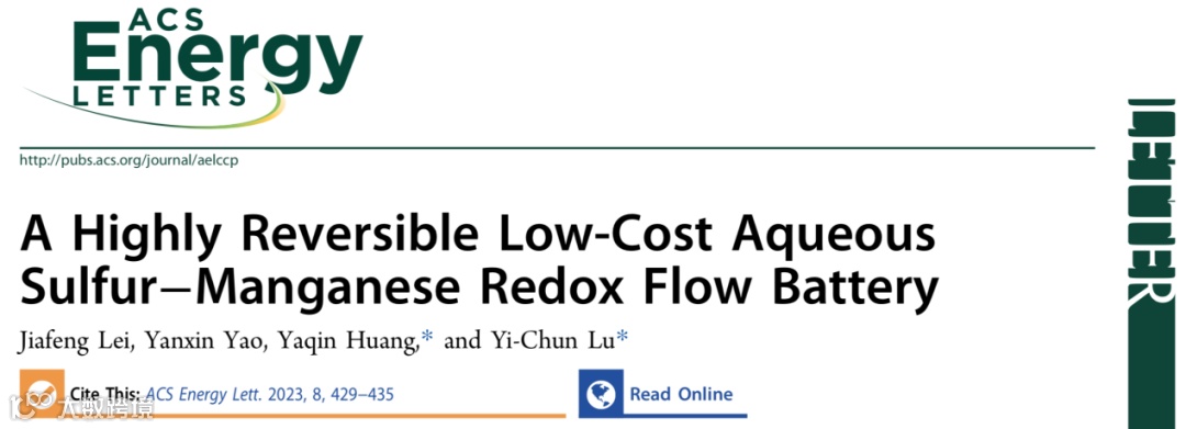 基于此,来自香港中文大学的卢怡君教授(通讯作者)以及北京化工大学的黃雅欽教授(通讯作者)在国际知名期刊ACS Energy Letters上发表题为“A Highly Reversible Low-Cost Aqueous Sulfur−Manganese Redox Flow Battery”的研究工作。