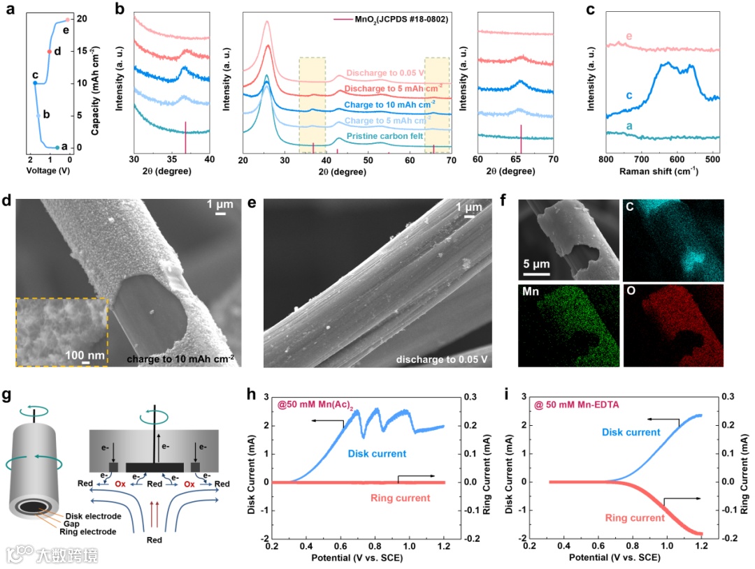 图 2. Mn2+/MnO2(s) 电极的机理分析。(a) S-Mn 电池的电压曲线。(b) 循环过程中 Mn2+/MnO2(s) 电极的非原位 XRD 表征。(c) 循环过程中正极碳毡上MnO2的拉曼光谱。(d)充电至10 mAh cm-2后的 SEM 图像。放电至 0.05 V的SEM 图像。(f) MnO2 电极的 EDX 光谱。RRDE 电极和工作机制的图示。(h) 50 mM Mn(Ac)2电解液 RRDE测试。(i) 50 mM Mn-EDTA电解液 RRDE测试。