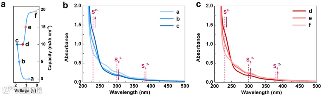 图 3. 多硫化物的非原位紫外-可见光光谱。(a) S-Mn 电池的代表性电压曲线。(b) 充电和 (c) 放电期间多硫化物物的紫外-可见光谱。