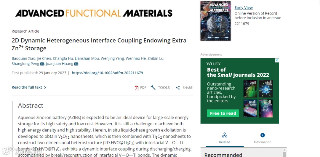 基于此,兰州大学材料与能源学院清洁能源材料与器件科研团队在国际知名期刊Advanced Functional Materials上发表题为“2D Dynamic Heterogeneous Interface Coupling Endowing Extra Zn2+ Storage”的研究性文章。该研究工作采用静电吸附自组装,制备了富含V-O-Ti界面异质键的二维异质结构材料HVO@Ti3C2。