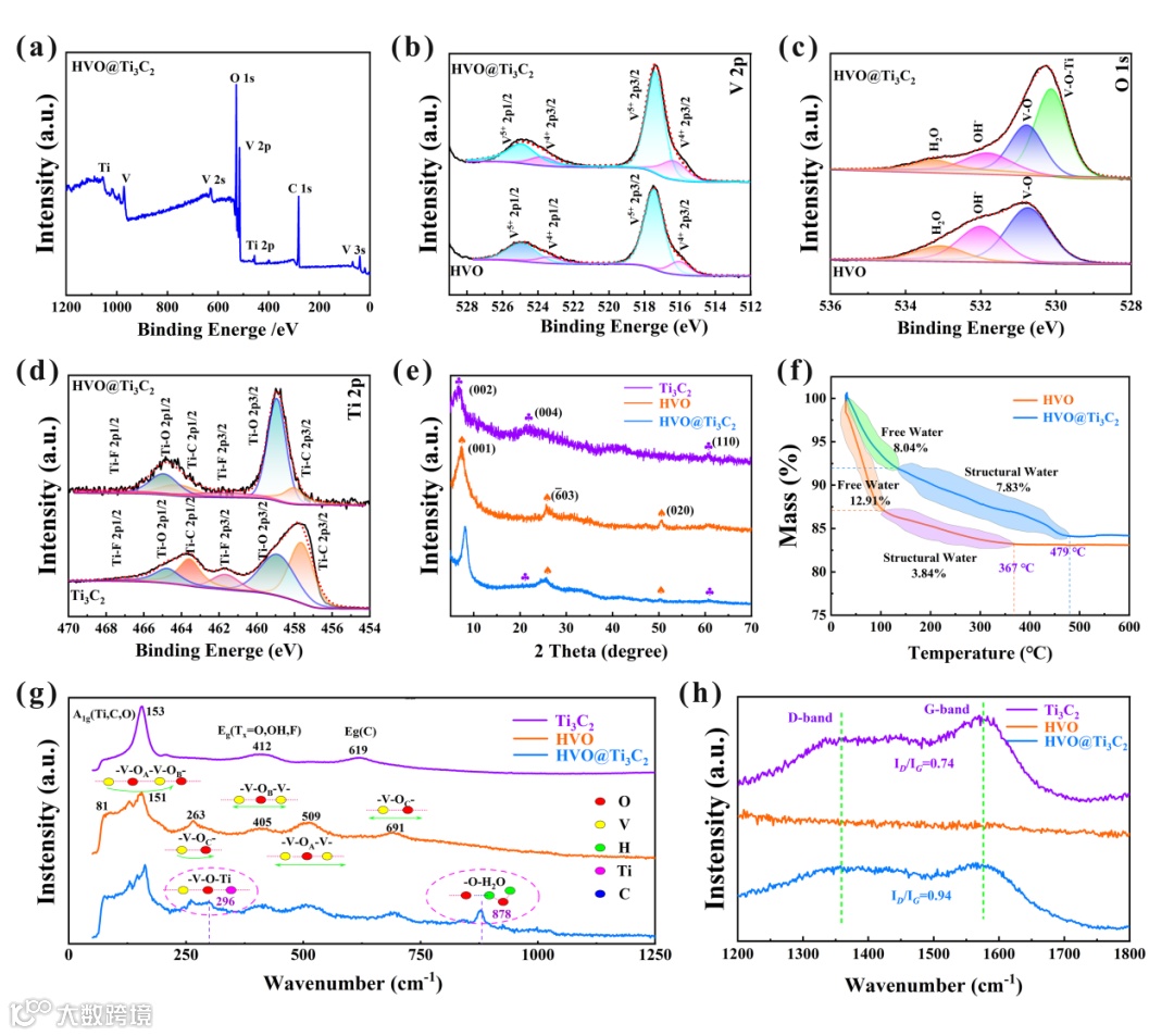 (a) XPS全谱,(b,c,d))分别为复合前后的V 2p、O 1s和Ti 2p的XPS精细光谱比较, (e,f)为HVO和HVO@Ti3C2的XRD和热重测试, (g,h)分别为0~1250 cm-1和1200~1800 cm-1范围内的Ranman光谱