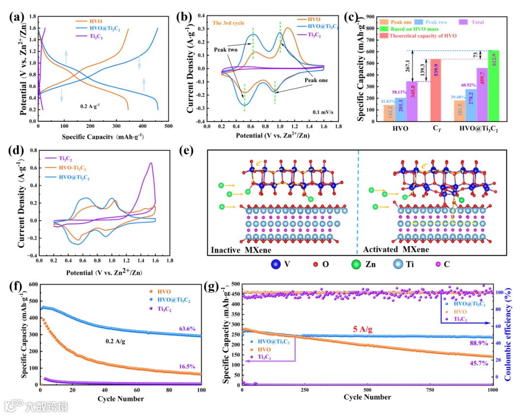 (a ,b)分别为HVO、HVO@Ti3C2和Ti3C2的第三圈GCD和CV循环曲线, (c)为容量贡献的分布直方图,(d)为Ti3C2、HVO-Ti3C2和HVO@Ti3C2的首次CV循环, e)Zn2+插入到HVO-Ti3C2和HVO@Ti3C2材料中的示意图,(f, g)分别为HVO@Ti3C2、HVO和Ti3C2电极在0.2 A g-1和5.0A g-1电流密度下的循环性能。