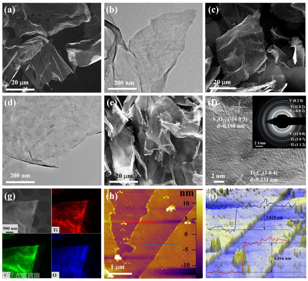 (a,b)和(c,d)分别为HVO纳米片和MXene纳米片的SEM、TEM图像,(e,f)分别为HVO@Ti3C2异质结构的SEM、HRTEM和SAED,(g)为HVO@Ti3C2的Ti、V和O元素的STEM图像和EDS映射图谱,(h,i)为HVO@Ti3C2材料的AFM测试结果。