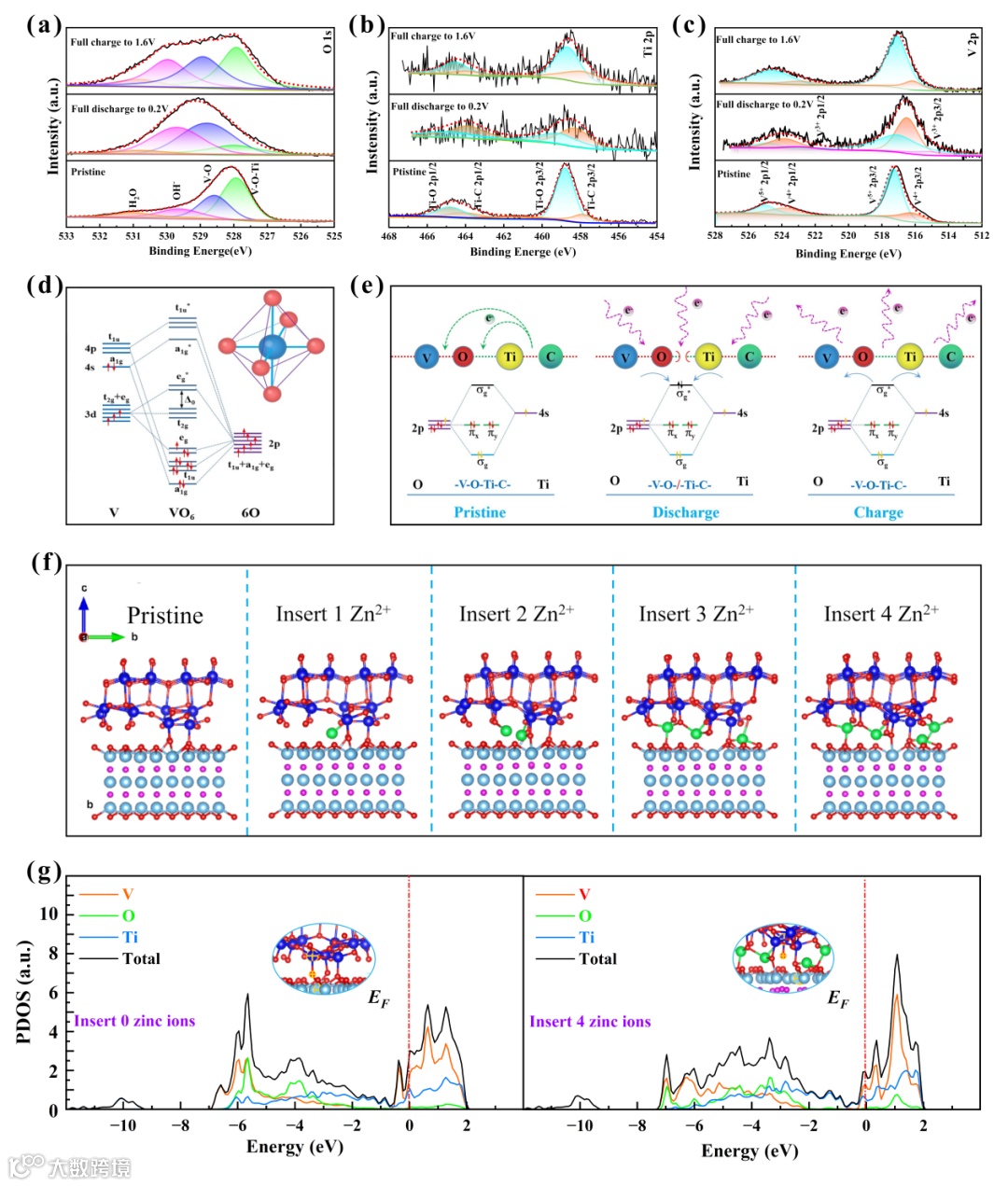 (a, b, c) 分别为O 1s、Ti 2p和V 2p能级在初始、完全放电和完全充电状态时的XPS精细谱,(d)VO6八面体的分子轨道和配位模型, (e) V-O-Ti异质键在不同状态下可逆断裂/重建的电子结构演绎,(f)当0、1、2、3、4个锌离子插入时,界面结构变化的DFT模型,(g)为插入0和4个Zn2+后V、O、Ti的PDOS。
