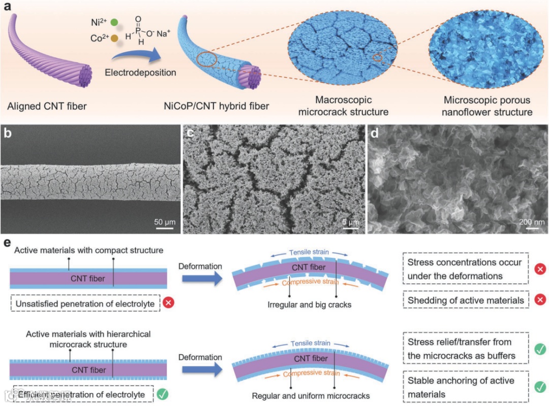 设计并构建了一种具有独特宏观微裂纹结构和微观多孔纳米花结构的柔性双金属磷化物/碳纳米管杂化纤维电极,该结构不仅有利于促进电解质的渗透和活性位点的暴露,还可以缓解纤维电极在变形时的应力集中,具有优异的电化学性能和机械柔性。