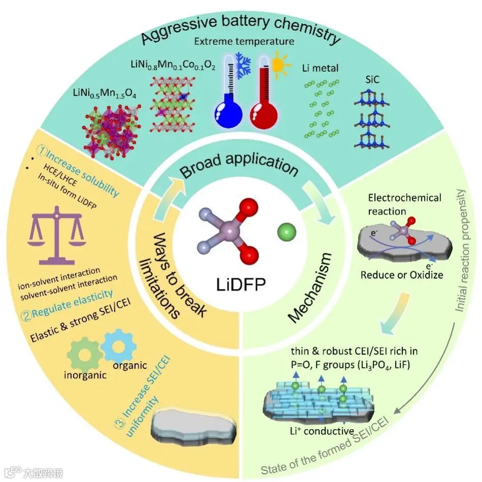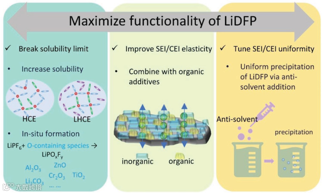 1)溶解度低:调控溶剂的溶剂化能力,或利用LiPF6分解原位生成LiDFP;