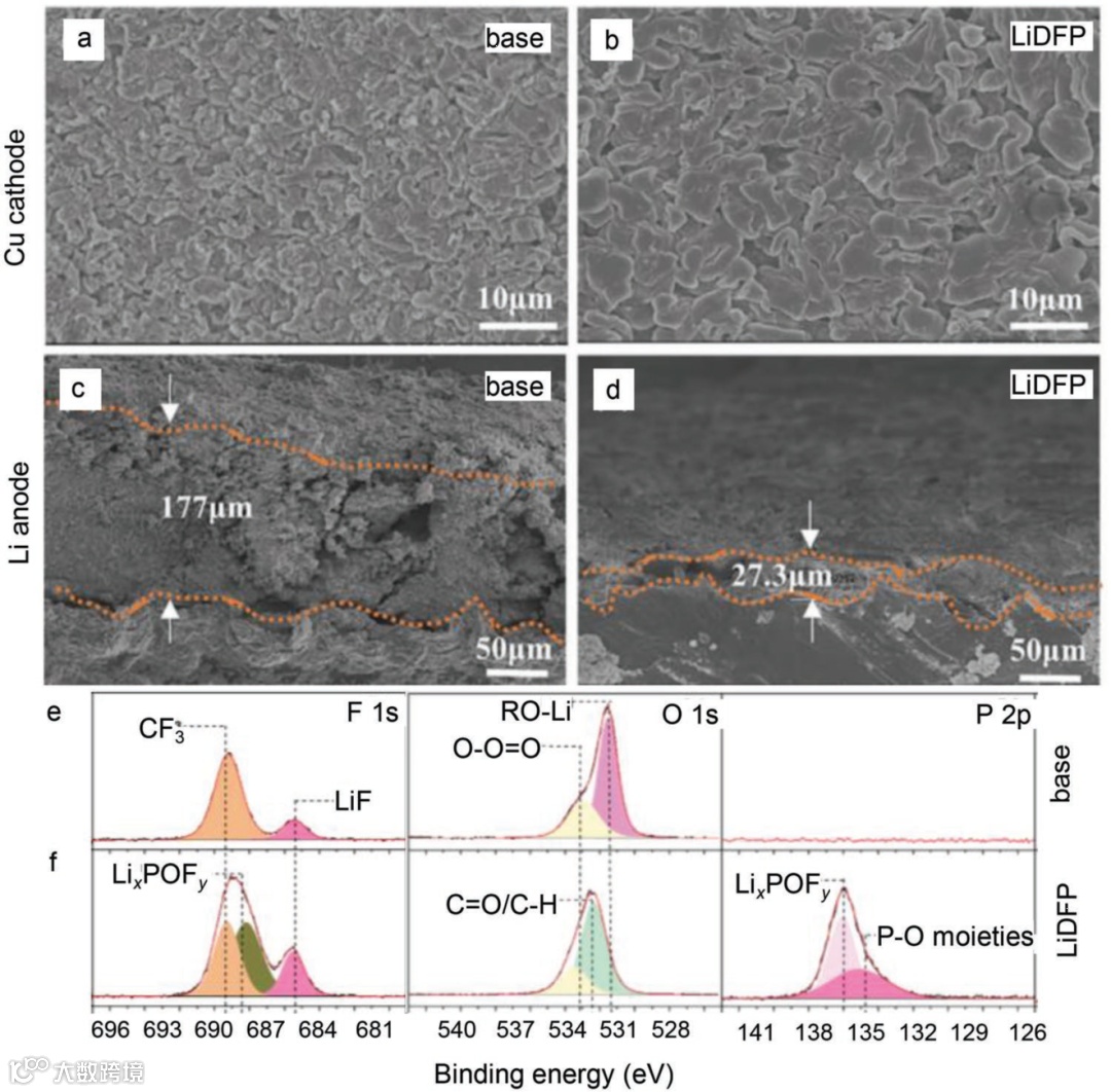 图2呈现了LiDFP改性后的正负极表面,改性后的正负极固体电解质膜表面更为平整、厚度更薄,且富含更多无机成分,如P=O阴离子基团、LiF等。