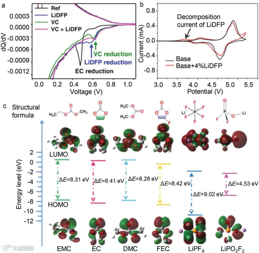 LiDFP作为添加剂对锂离子/金属锂电池的电化学改性主要是通过在正负极表面生成一层在热力学及力学上都较为稳定的固体电解质膜。目前我们对其工作的机理的理解主要集中在两个方面:初始分解反应及反应成膜产物。