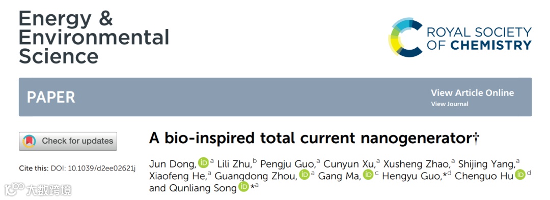 J. Dong, L. Zhu, P. Guo, C. Xu, X. Zhao, S. Yang, X. He, G. Zhou, G. Ma, H. Guo*, C. Hu, Q. L. Song*. A bio-inspired total current nanogenerator. Energy & Environmental science, 2023, DOI:10.1039/D2EE02621J.,