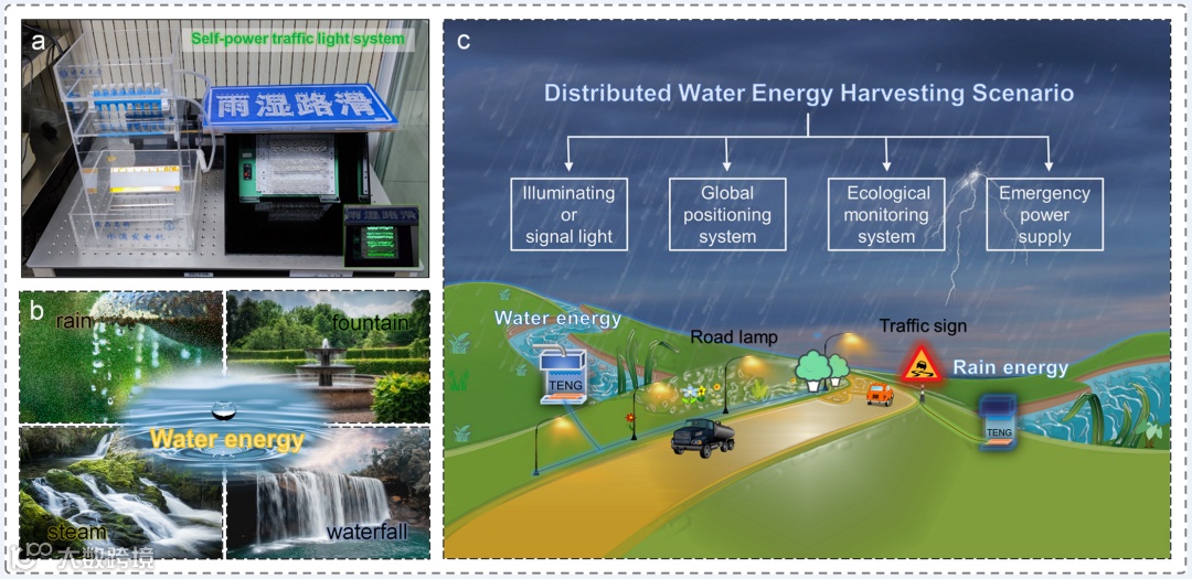 鉴于该TC-TENG的出色能力,我们进一步展示了一个自供电交通灯系统的演示原型,该系统可在偏远地区的雨天收集分布式水能(见图5)。典型的服务场景是在水源或雨水丰富但没有电网的山区或野外的照明应用。当有暴雨时,自供电系统可以通过雨水为交通信号灯供电,以防因路标不清晰而发生交通事故。