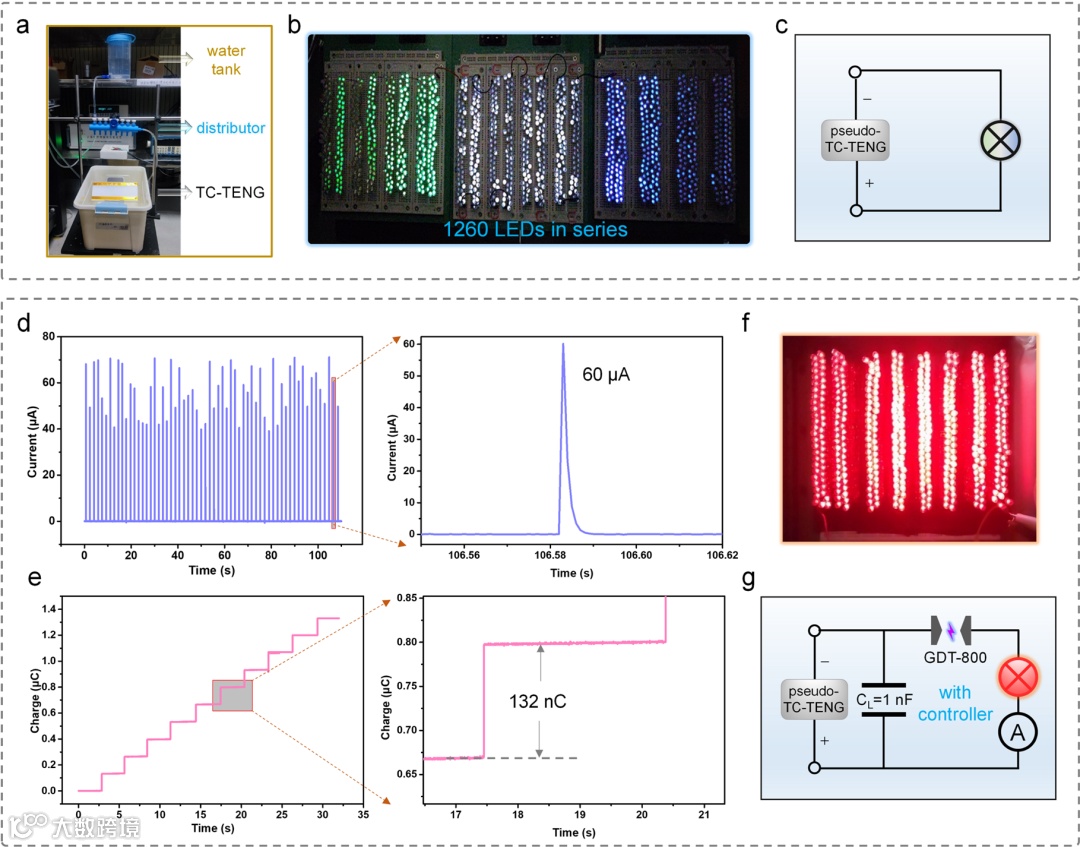 TC-TENG利用固液接触起电效应将水能转化为直流电,不仅理论上使用寿命长,而且无需整流单元即可单独直接驱动电子器件。图4展示了TC-TENG输出性能。首先演示了TC-TENG直接驱动1260个串联彩色LED的能力。这一结果表明它具有超高的输出电压,远高于目前报道的基于液滴的纳米发电机。其次,我们用优化的控制器演示了TC-TENG的高输出性能,可同时点亮400个高亮红色LED。