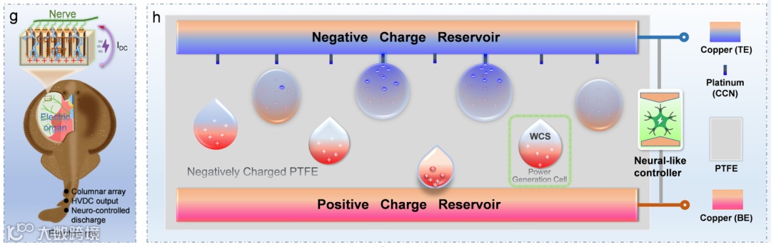 图1. 电鳐启发的固液全电流纳米发电机架构设计与应用。