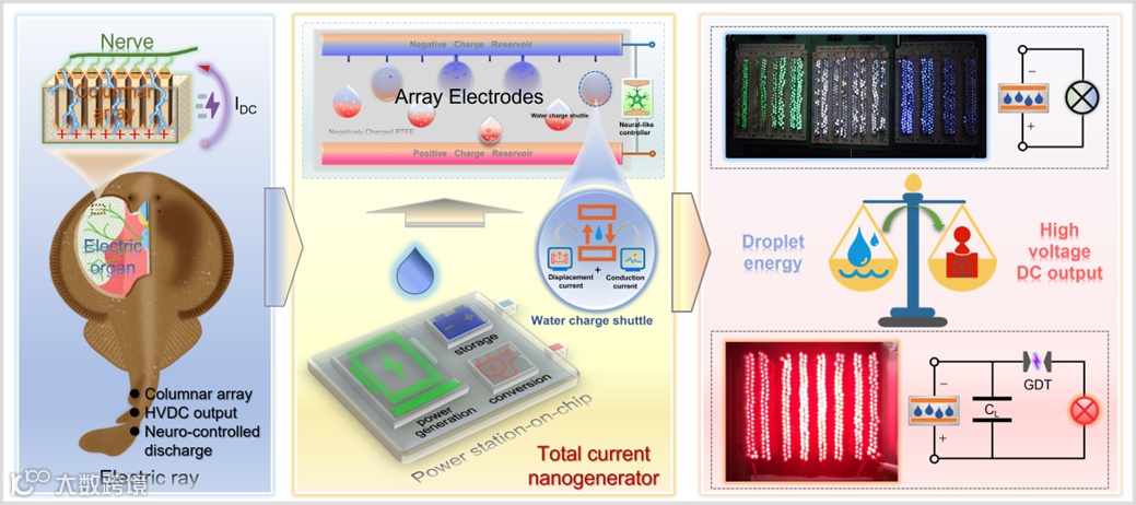 不同于经典的位移电流纳米发电机,该纳米发电机利用位移电流和传导电流共同作为驱动力,无需整流器即可输出高压直流电。这个新概念器件被定义为全电流纳米发电机,它具有紧凑阵列架构、高压直流输出、可控能量释放等特点,成功实现了如同电鳐一般瞬间释放“高压电击”的这一能力。