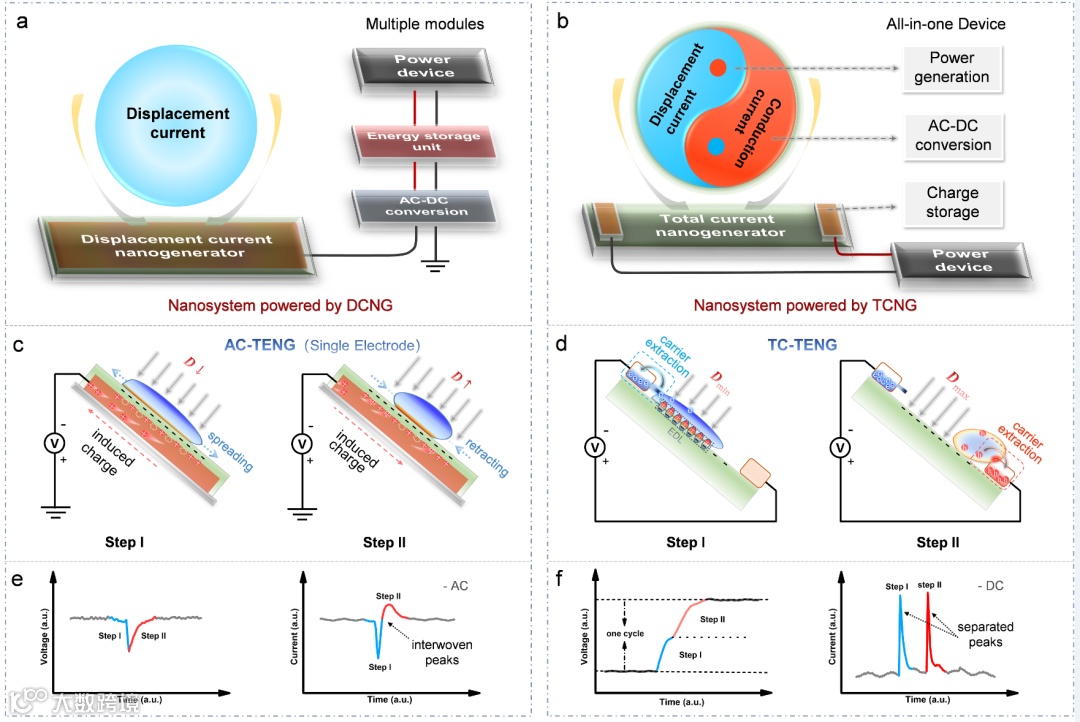 图2 基于位移电流纳米发电机和全电流纳米发电机的纳米能源系统对比,并进一步分析了基于液滴的AC-TENG和TC-TENG的代表性物理过程和输出属性。