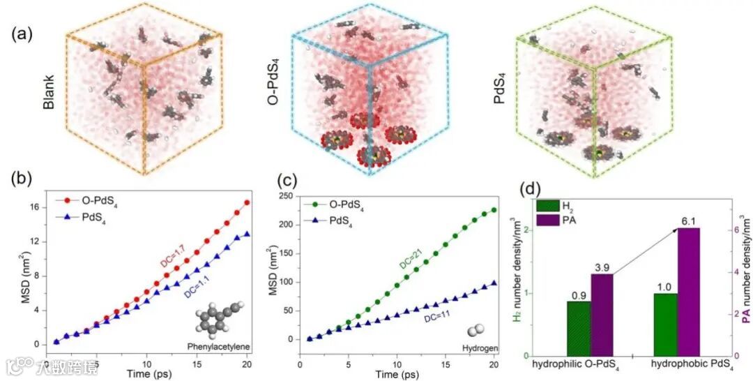 图4. 分子动力学模拟。(a)不同体系中苯乙炔分子、H2分子在20 ns时的分布快照;(b)苯乙炔分子在不同亲疏水模型上的扩散系数;(c)氢气分子在不同亲疏水模型上的扩散系数;(d)苯乙炔分子、氢气分子在不同亲疏水模型上的数密度对比图