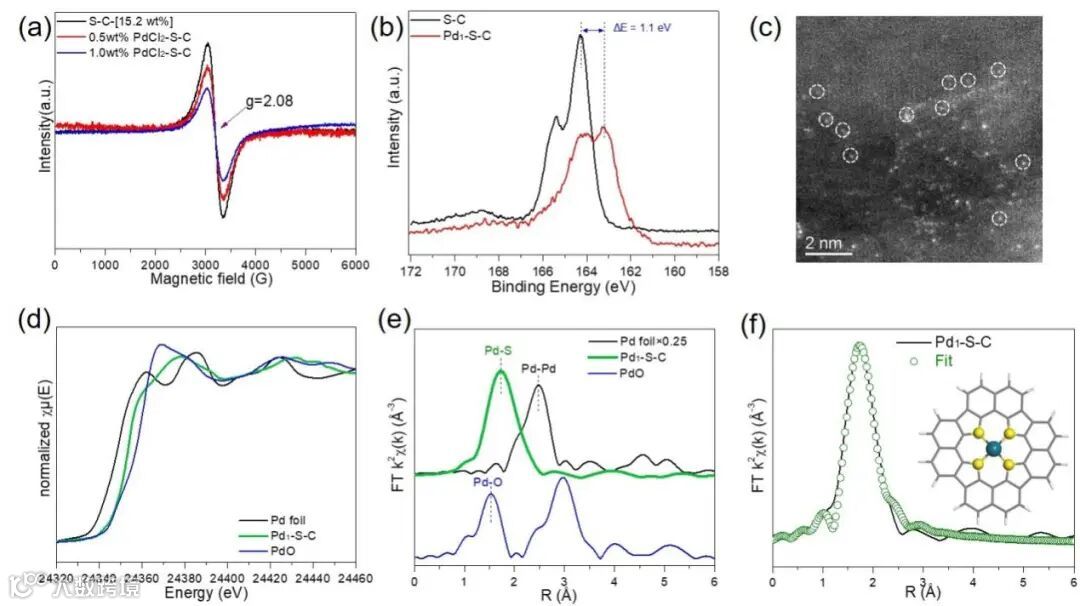 图3. Pd1-S-C单原子催化剂的结构表征。(a)PdCl2-S-C前驱体的固态EPR;(b)S2p XPS精细谱;(c)球差电镜;(d)Pd1-S-C单原子催化剂及标准品的XANES谱图;(e)Pd1-S-C单原子催化剂及标准品的r空间EXAFS谱图;(f)Pd1-S-C的拟合曲线及模型示意图