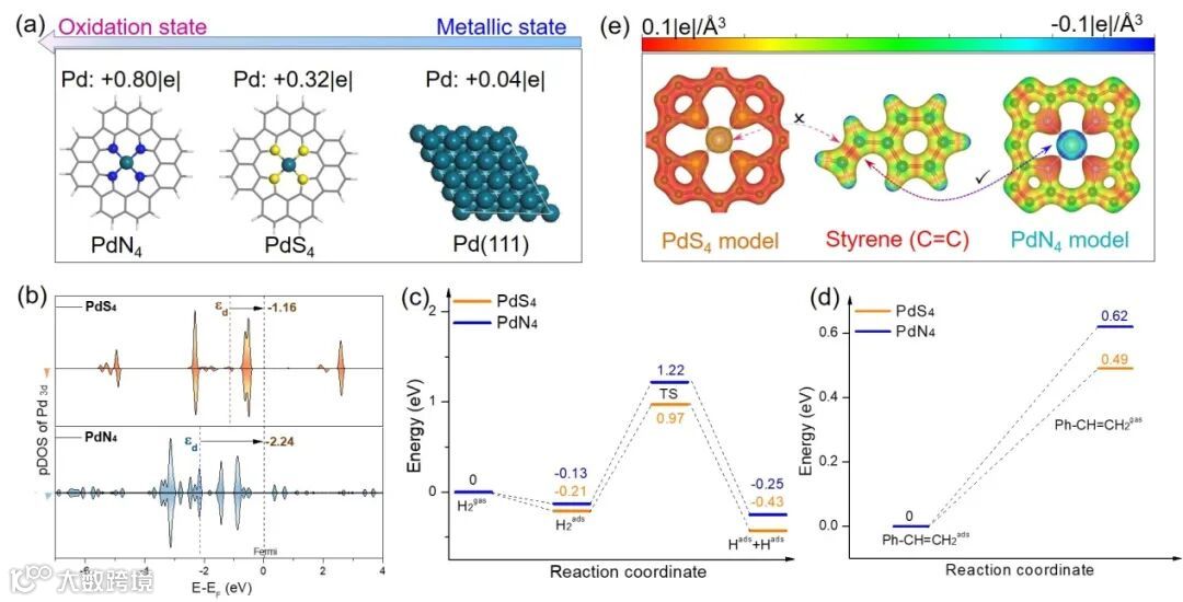 图5. 理论计算。(a)巴德电荷分析;(b)PdS4和PdN4模型的pDOS图;(c)H2分子在不同模型上解离活化过程的能量台阶图;(d)苯乙烯分子在不同模型上的脱附过程的能量台阶图;(e)不同模型的电荷密度图