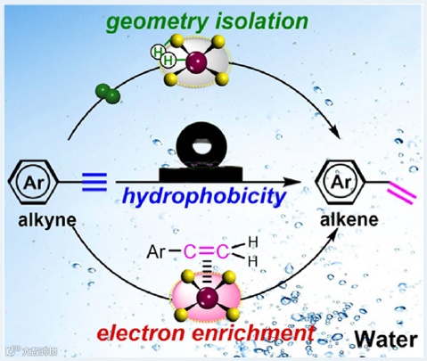 图1. 疏水型硫配体修饰的钯单原子催化剂用于水系有机炔烃选择性加氢反应示意图