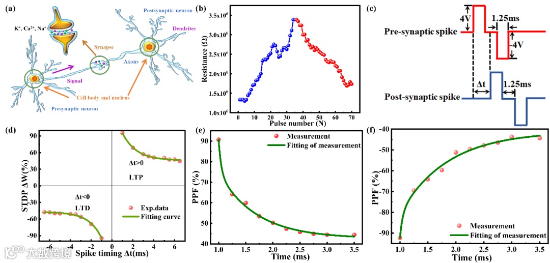 图4:(a),生物突触的结构示意图;(b),脉冲数量与器件电阻之间的关系;(c)尖峰时序依赖可塑性(STDP)模拟的脉冲波形示意图;(d)器件的尖峰时序依赖可塑性;(e)、(f),器件的双脉冲易化(PPF)可塑性。