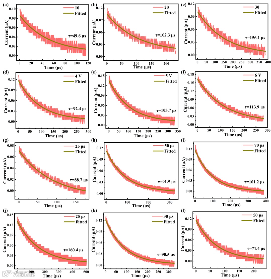 图3:(a)-(c),不同脉冲数量条件下的兴奋性突触后电流(EPSC)测试响应(橙色曲线)和拟合曲线(绿色曲线)的比较;(d)-(f),不同脉冲幅值条件下的EPSC测试响应(橙色曲线)和拟合曲线(绿色曲线)的比较;(g)-(i),不同脉冲宽度条件下的EPSC测试响应(橙色曲线)和拟合曲线(绿色曲线)的比较;(j)-(l) 不同脉冲间隔条件下的EPSC测试响应(橙色曲线)和拟合曲线(绿色曲线)的比较。