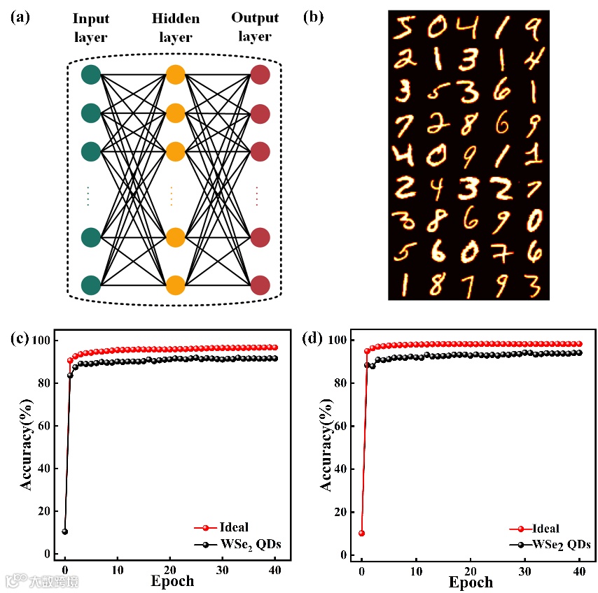 图5:(a),三层的神经网络结构;(b),MNIST数据集中的部分手写数字图像展示;(c),手写数字的光学识别数据集在神经网络模拟中的识别率与理想情况下的对比;(d),MNIST数据集在神经网络模拟中的识别率与理想情况下的对比。