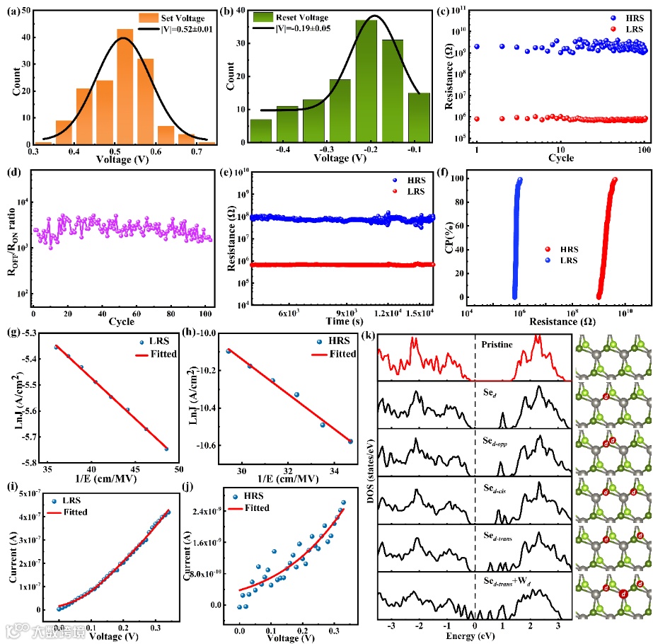 图2:(a)、(b),Set、Reset 电压分布的直方图和高斯拟合曲线;(c),高低阻分布;(d),器件的ROFF/RON;(e) 器件的保持特性;(f),低阻态和高阻态的累积概率图;(g)、(h),低阻态和高阻态的线性拟合曲线;(i)、(j),通过公式(1)-(3)获得的低阻态和高阻态的拟合曲线;(k),本征WSe2和五个缺陷模型的态密度。