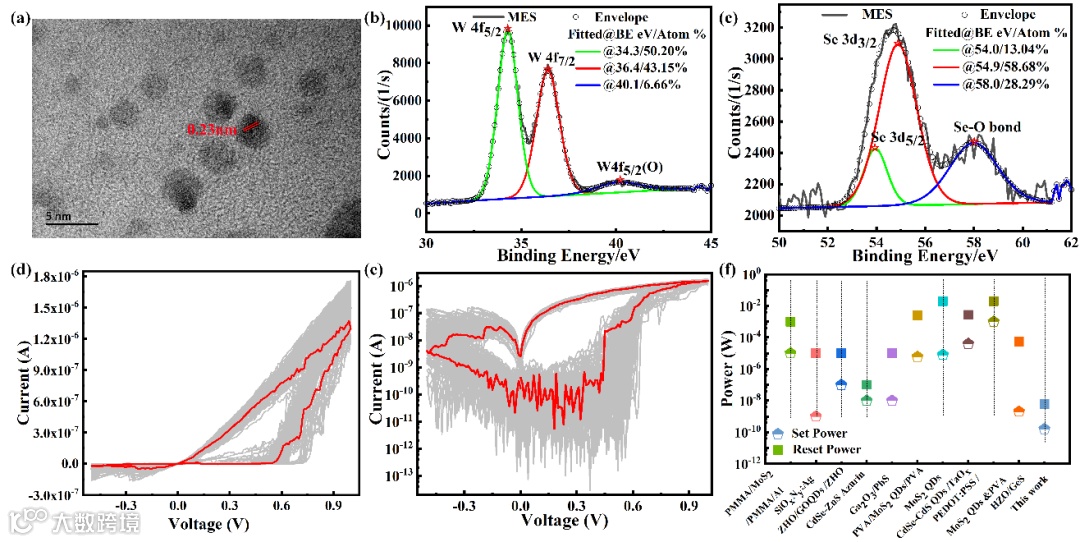图1 :(a) WSe2量子点的HR-TEM图像;(b)、 (c),WSe2量子点的XPS 表征结果;(d) 器件的I-V曲线;(e) 对数形式的I-V曲线;(f) 与其他量子点忆阻器功率的对比。