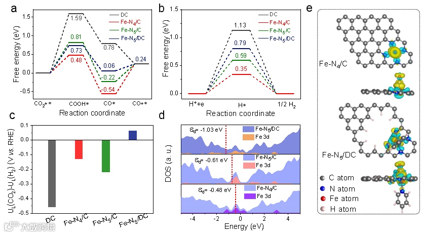 DFT计算结果表明,FeN5耦合缺陷碳DC可以诱导Fe中心的电子局域化,d带中心左移,有效的加速CO*关键中间体的脱附,并且抑制H*的吸附,从而提高了CO2RR的活性和选择性。