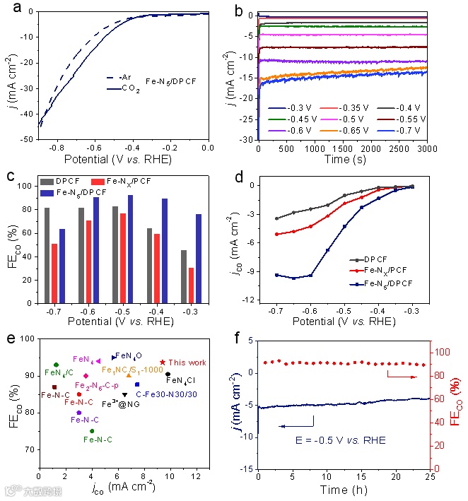 电化学测试表明,Fe-N5/DPCF催化剂在-0.5 V vs. RHE下的CO法拉第效率(FECO)高达93.1%,-0.5 V vs. RHE下,CO分电流密度为-9.4 mA cm-2,持续电解25 h后,仍然能保持高选择性(>90%),表现出良好的电化学CO2RR催化性能。