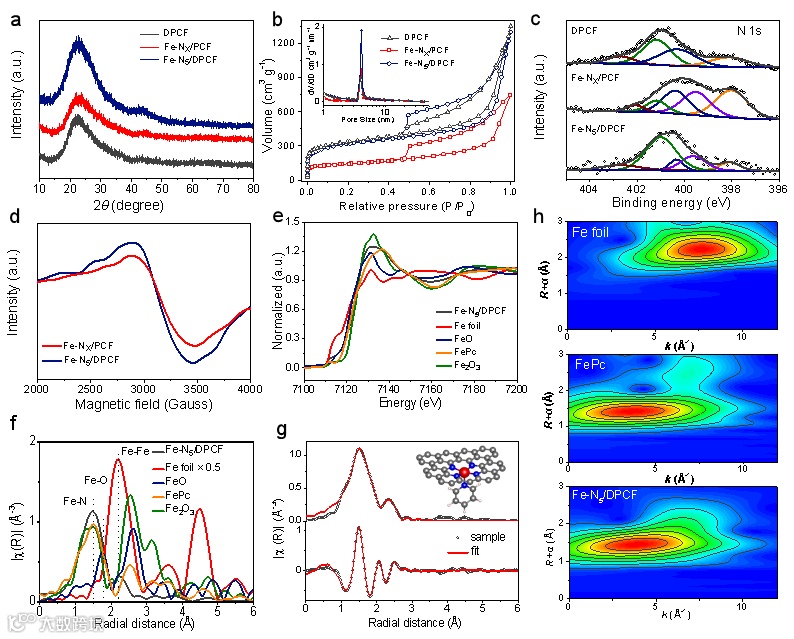 图2. (a, b) DPCF, Fe-NX/PCF, Fe-N5/DPCF的XRD和孔径分布图;(c) N 1s的光谱图;(d) EPR谱图;(e, f, g) X射线吸收光谱图;(h) 小波变换图。