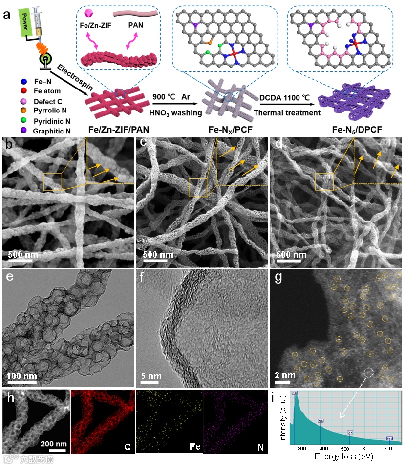 图1. (a) Fe-N5/DPCF的制备流程图;(b, c, d)Fe/Zn-ZIF/PAN, Fe-NX/PCF, Fe-N5/DPCF的SEM图;(e, f) Fe-N5/DPCF的TEM图和HR-TEM图;(g, i) Fe-N5/DPCF的球差电镜和EELS图;(h) Fe-N5/DPCF的HAADF-STEM图和Fe, N, C元素分布图。