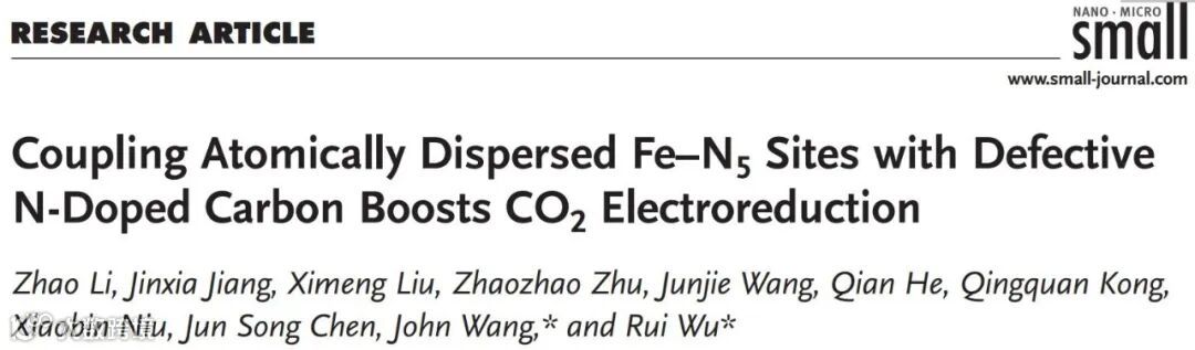基于此,来自电子科技大学的吴睿副研究员、陈俊松教授与新加坡国立大学的John Wang教授合作,在国际知名期刊Small上发表题为 “Coupling Atomically Dispersed Fe–N5 Sites with Defective N-Doped Carbon Boosts CO2 Electroreduction” 的研究文章。