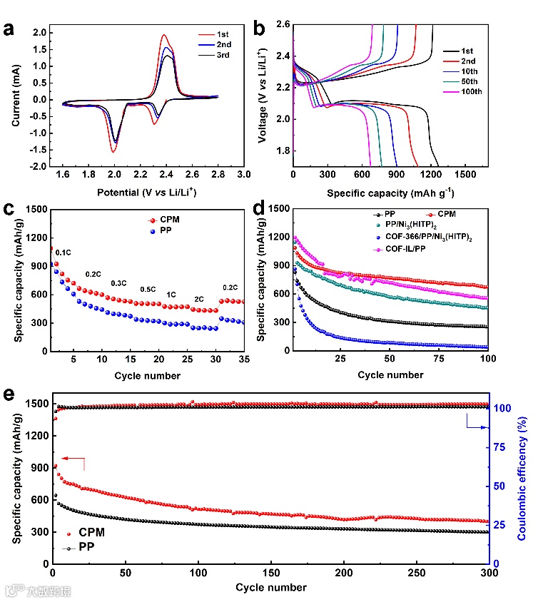 在电池测试中,CPM也表现出了较高的比容量以及优于商品化PP的循环和倍率性能。