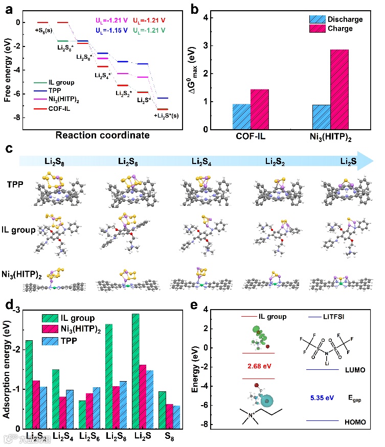 图5. 基于CPM的Li-S电池的DFT计算。(a) CPM上吸附LiPSs路径的自由能图。(b) CPM中COF-IL和Ni3(HITP)2的基本步骤中最大的吉布斯能量。(c) 反应中心的优化吸附路径(上图为TPP中心,中间为IL官能团中心,底部为Ni3(HITP)2中心)。(d) Li2Sx在CPM中不同反应中心的吸附能。(e) IL和LiTFSI的HOMO-LUMO能级。