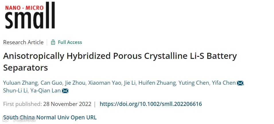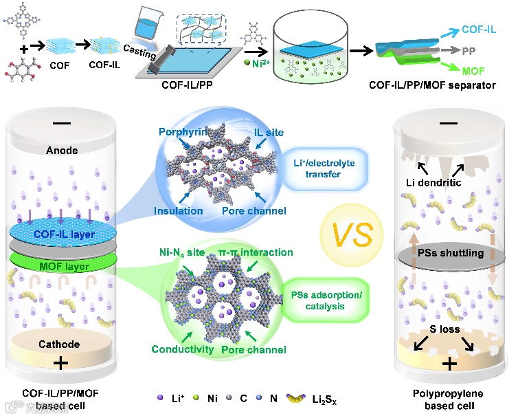 基于此,来自华南师范大学的兰亚乾教授、陈宜法教授课题组在国际知名期刊Small上发表题为“Anisotropically Hybridized Porous Crystalline Li-S Battery Separators”的观点文章。该文章报道了一种基于离子液体修饰的卟啉基共价有机骨架(COF-366-OH-IL)和具有催化活性的金属有机骨架(Ni3(HITP)2)的各向异性杂化隔膜(CPM),它可以将多硫化物(LiPSs)吸附/催化转化位点和离子传导位点集成在一起,以定向满足电极的要求。